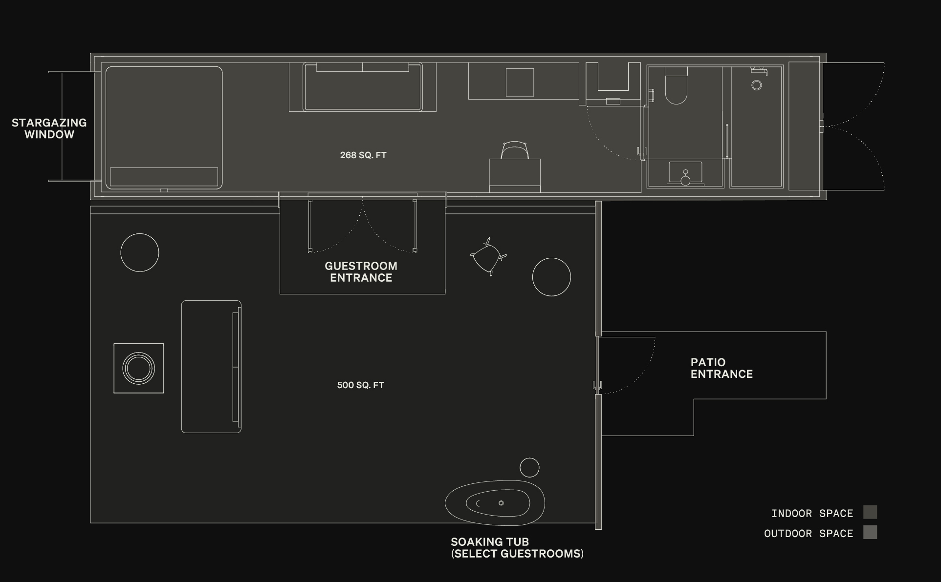 An immersive retreat where you can take in panoramic views from your outdoor stone tub, stargaze from your private patio with fire pit, and reset in your design-forward room with King bed.