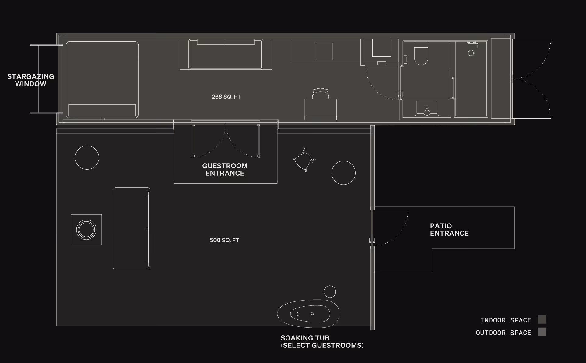 An immersive retreat where you can take in panoramic views from your outdoor stone tub, stargaze from your private patio with fire pit, and reset in your design-forward room with King bed.